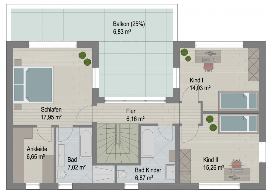 Im Erdgeschoss befindet sich das kombinierte Esszimmer mit Küche, ein großzügiger Wohnbereich, sowie ein weiteres Zimmer, das als Büro oder Gästezimmer genutzt werden kann. Im Obergeschoss sind die Individualräume angeordnet: 2 Kinderzimmer mit eigenem Bad und der komfortable Elternbereich mit Ankleide und separatem Bad. Ein großer Balkon, der von zwei der Zimmer, sowie dem Flur betreten werden kann, bietet zusätzlichen Wohnkomfort.