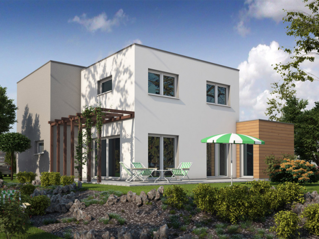 Äußerlich zeichnet es sich durch seine klaren und modernen Fronten, sowie dem Flachdach aus. Im Inneren besticht es im Erdgeschoss durch eine großzügige und offen gehaltene Grundrissplanung. Durch die großen Fensterflächen entstehen helle und freundliche Räume, die zum verweilen einladen. Im Obergeschoss findet man die private Zone des Hauses; 3 Schlafzimmer mit jeweils einem Ankleideraum und 2 Bäder verteilen sich auf 74 m².