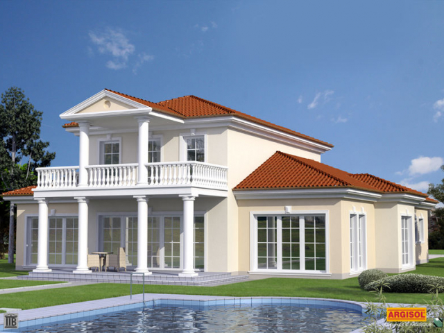 Die parkähnliche Anlage im vorderen Grundstücksbereich lädt zum Eintreten und Wohlfühlen ein. Der Hauseingang befindet sich im 2-geschossigen, zentral gelegenen Baukörper, dessen Zeltdach die seitlich angeordneten Gebäude überragt. Befindet man sich im Inneren des 172 m² großen Erdgeschosses, wird man von offenen, hohen und lichtdurchfluteten Räumen empfangen. Über eine Treppe gelangt man in das ca. 70 m² große Obergeschoss. Ein besonderer Blickfang ist die Einheit aus säulengerahmter überdachter Terrasse und dem darüber liegenden Balkon mit einem säulengestützten Tympanon.
